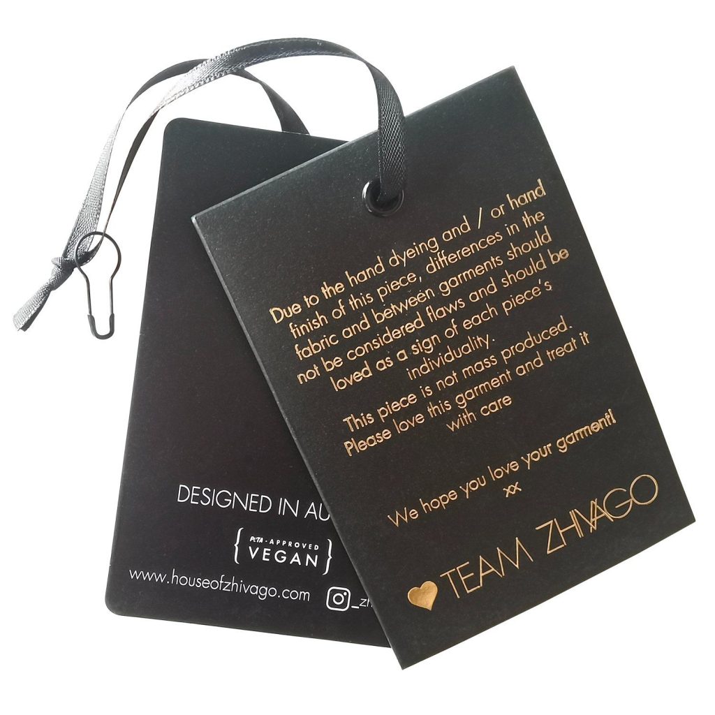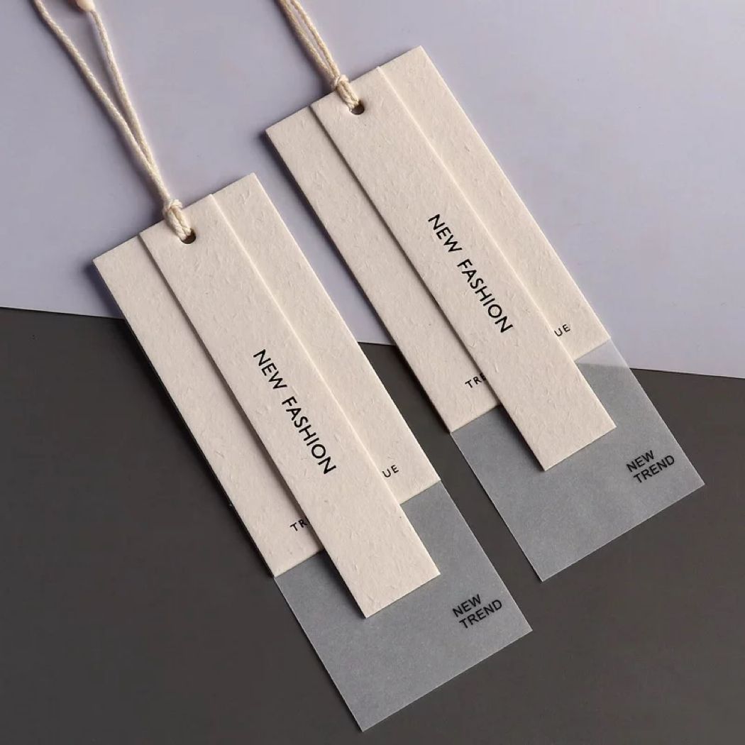 Hang-tag quần áo, túi xách, giày dép mang thông tin giá, mã SKU, hướng dẫn chăm sóc và câu chuyện thương hiệu. Vật liệu giấy kraft tái chế hoặc card ivory cao cấp kết hợp ép kim và emboss tạo cảm giác xa xỉ phù hợp định vị thương hiệu thời trang.